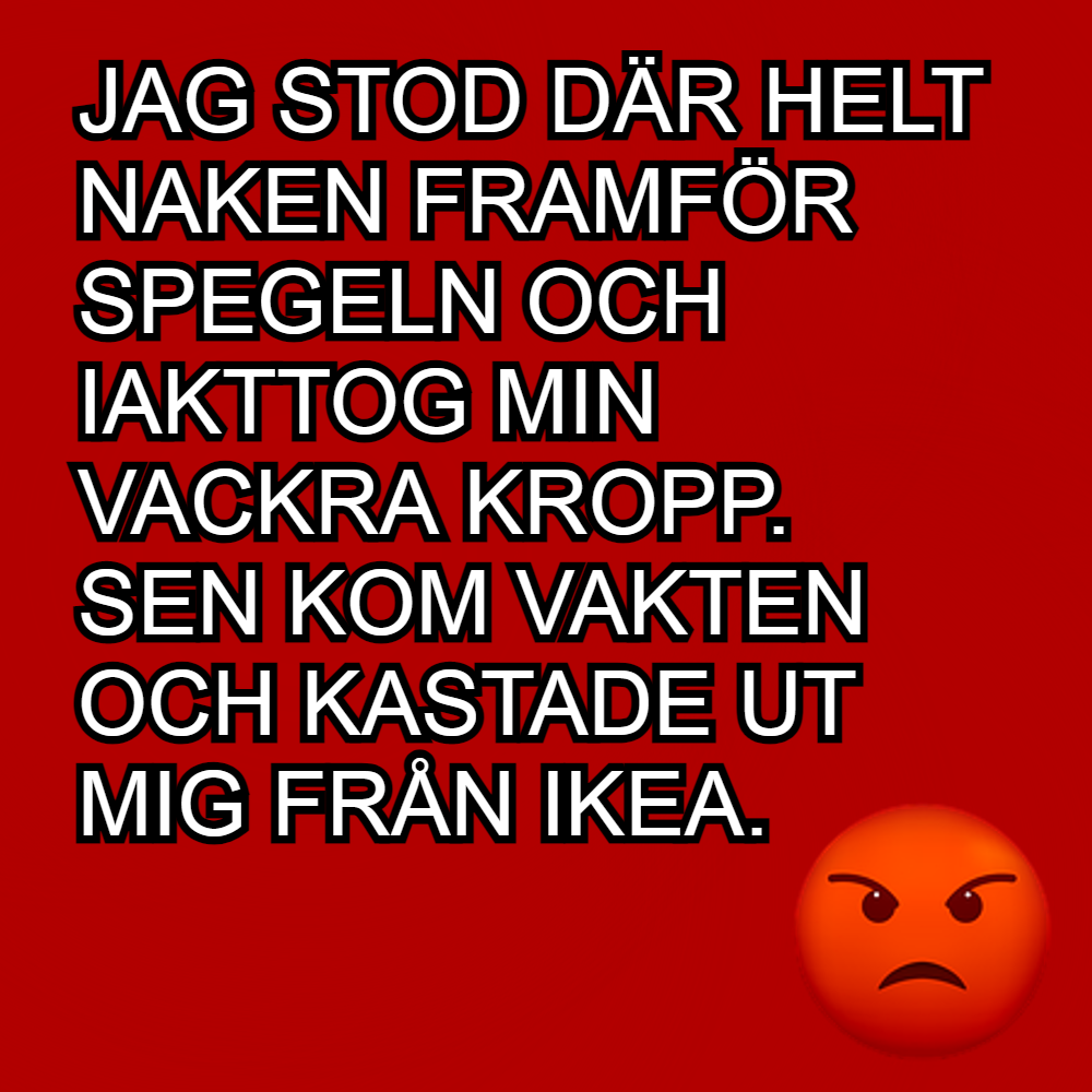 Jag stod där helt naken framför spegeln och iaktog min vackra kropp, sen kom vakten och kastade ut mig från IKEA.